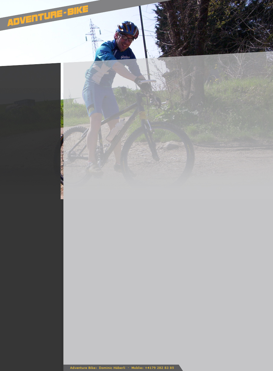 Die Freiheit, sich stets neuen Herausforderungen zu stellen und das gesunde Gleichgewicht zwischen Körper und Geist. Auch begeistert mich das ständige Erweitern der Bike-Technik, die durch die vielen verschiedenen Untergründe eine besondere Körperbeherrschung erfordern und mich Eins werden lassen mit dem Bike. Nicht zuletzt sind es die atemberaubenden Berg-, Wald-, und Flussgebiete, die einen den Alltag auf wunderbare Weise vergessen lassen. Die Bike-Regionen Gstaad, Saanenland und Basel, Baselland liegen mir besonders am Herzen. War ich nicht zuhause im Baselbiet am Trainieren oder an einem Bike-Rennen, verbrachte ich viele Wochenenden und meine Ferientage in den Bergen. Warum ADVENTURE-BIKE Ich war selbst in einem Bike-Shop in Gstaad tätig und habe gespürt, dass das Interesse an geführten Bike-Touren gross ist. Ich sah darin die Verwirklichung eines bisher unerfüllten Traumes, Biken nicht mehr bloss als Hobby für mich alleine zu geniessen, sondern auch anderen die Begeisterung für diesen tollen Sport weitergeben zu dürfen. Dein ADVENTURE-BIKE Guide Dominic Häberli |